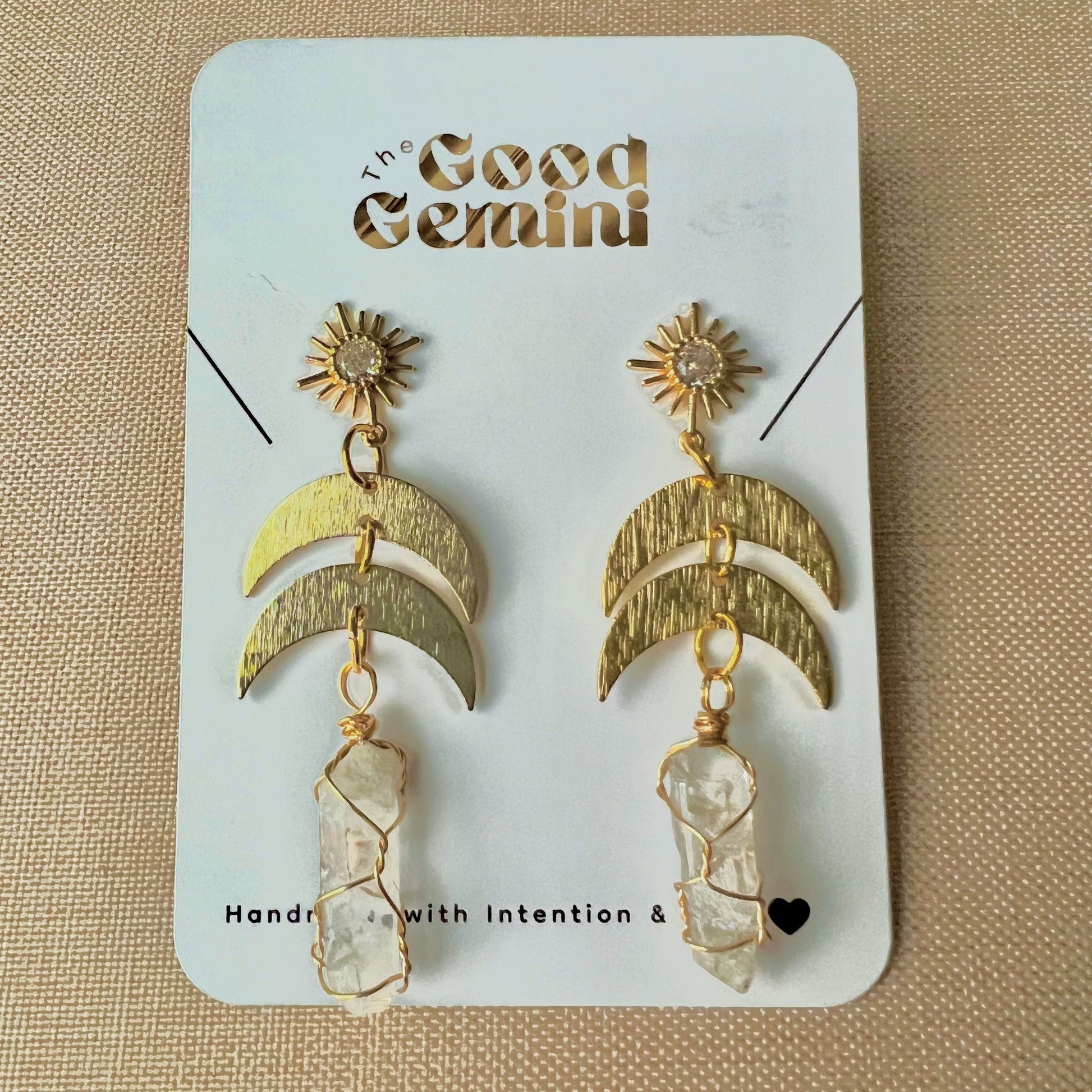 Upgrade your earring game with our Double Crescent Quartz Dangles. These unique earrings feature double crescent moons made out of sparkling quartz crystals. Add a touch of magic and whimsy to any outfit with these playful and stylish dangles. (Moon lovers rejoice!)